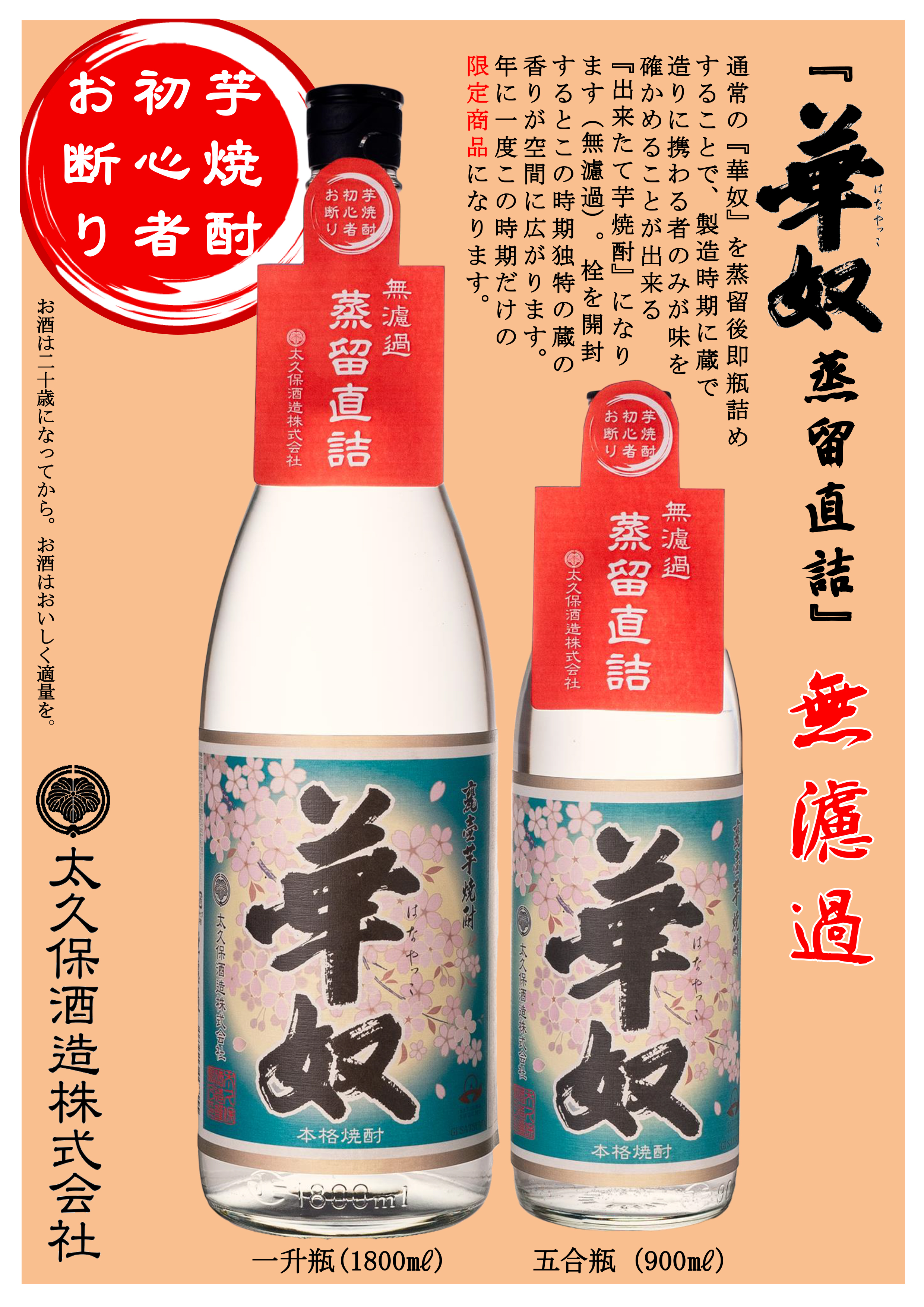 本商品は、看板銘柄「華奴(はなやっこ)」の蒸留後に”即瓶詰”したできたてホヤホヤの新焼酎になります。