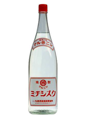 透明瓶に「白のラベル」「赤文字」で昔ながらの醬油、みりんのようなデザインを思わせる人気のレトロラベルシリーズ第三弾の「マルニシミチシズク」。