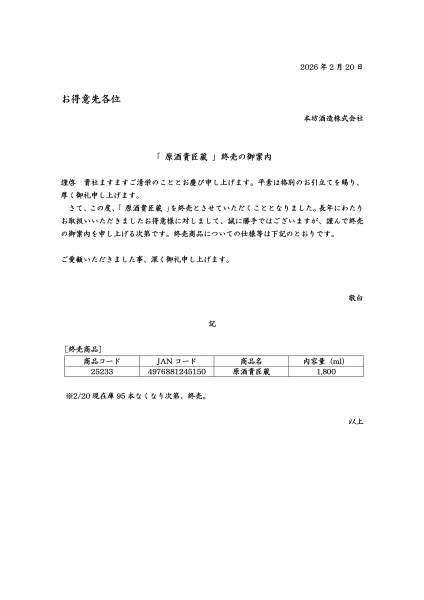 本坊酒造様より「終売ご案内(原酒貴匠蔵)」。・・・