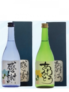 書家が「一枚一枚」手書きで「感謝」「ありがとう」の文字を書き、手造りの「ちぎり絵花」が貼られている「和紙ラベル(鶴田和紙)」