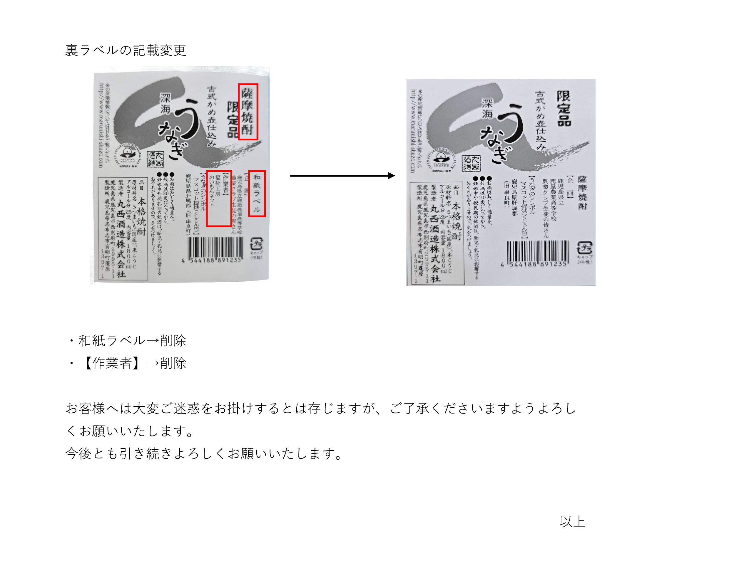 『深海うなぎ』『紅芋深海うなぎ』の表ラベルの仕様変更とそ れに伴う裏ラベルの記載変更をさせていただくことになりましたのでお知らせいたします。
