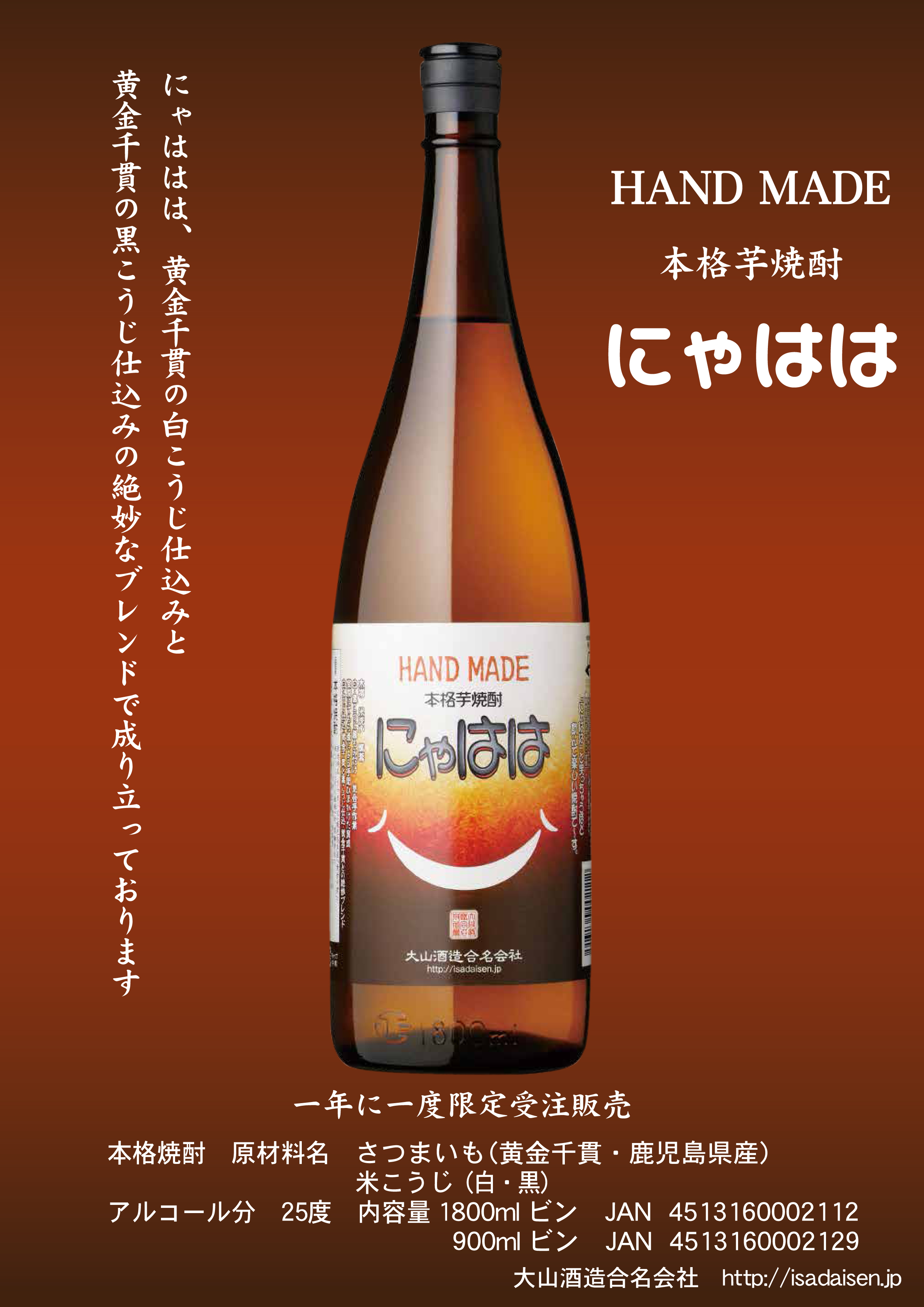 ⇒ 「白麹+黒麹」+「黄金千貫」+常圧蒸留(お湯割り、水割り双方で美味しい「笑顔」になれる焼酎!?)