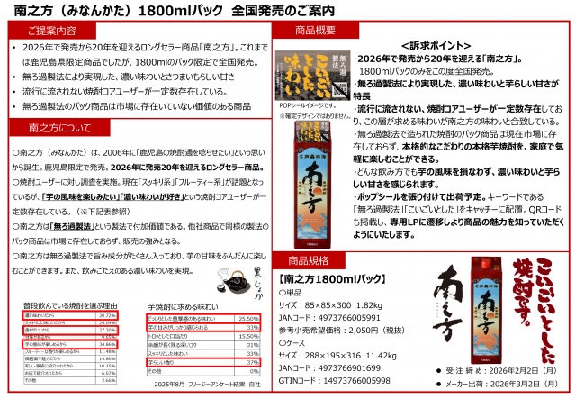本商品は20年前に発売されたTHE 飲兵衛向けの芋焼酎「南之方(みなんかた)※鹿児島限定」の紙パック版が、全国発売となります。